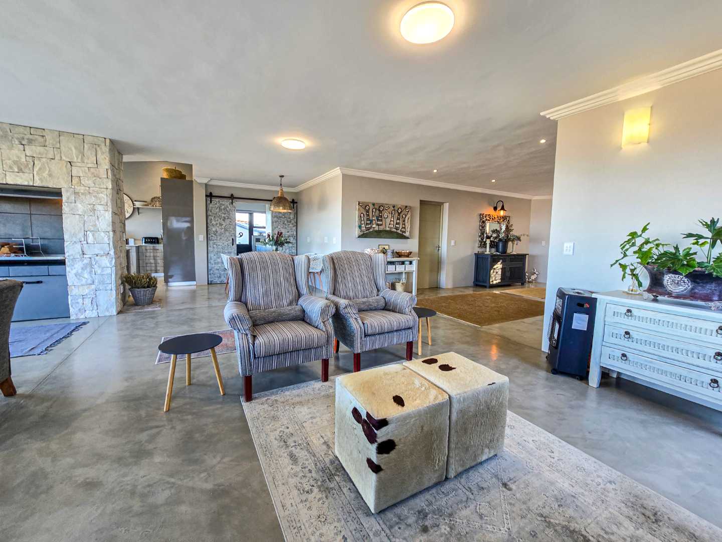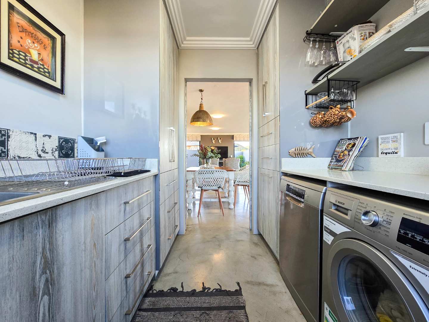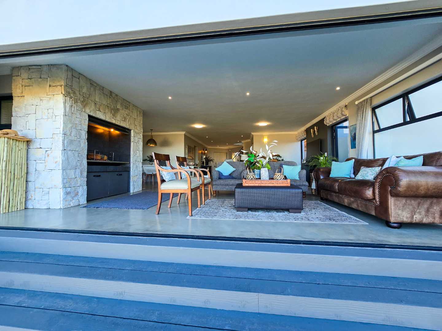 Step into an airy, open-plan living space where the modern kitchen, dining area and lounge flow seamlessly together – ideal for entertaining or spending quality time with family. A built-in braai ensures year-round gatherings, no matter the weather, while a separate scullery and laundry room keep things neat and organized.