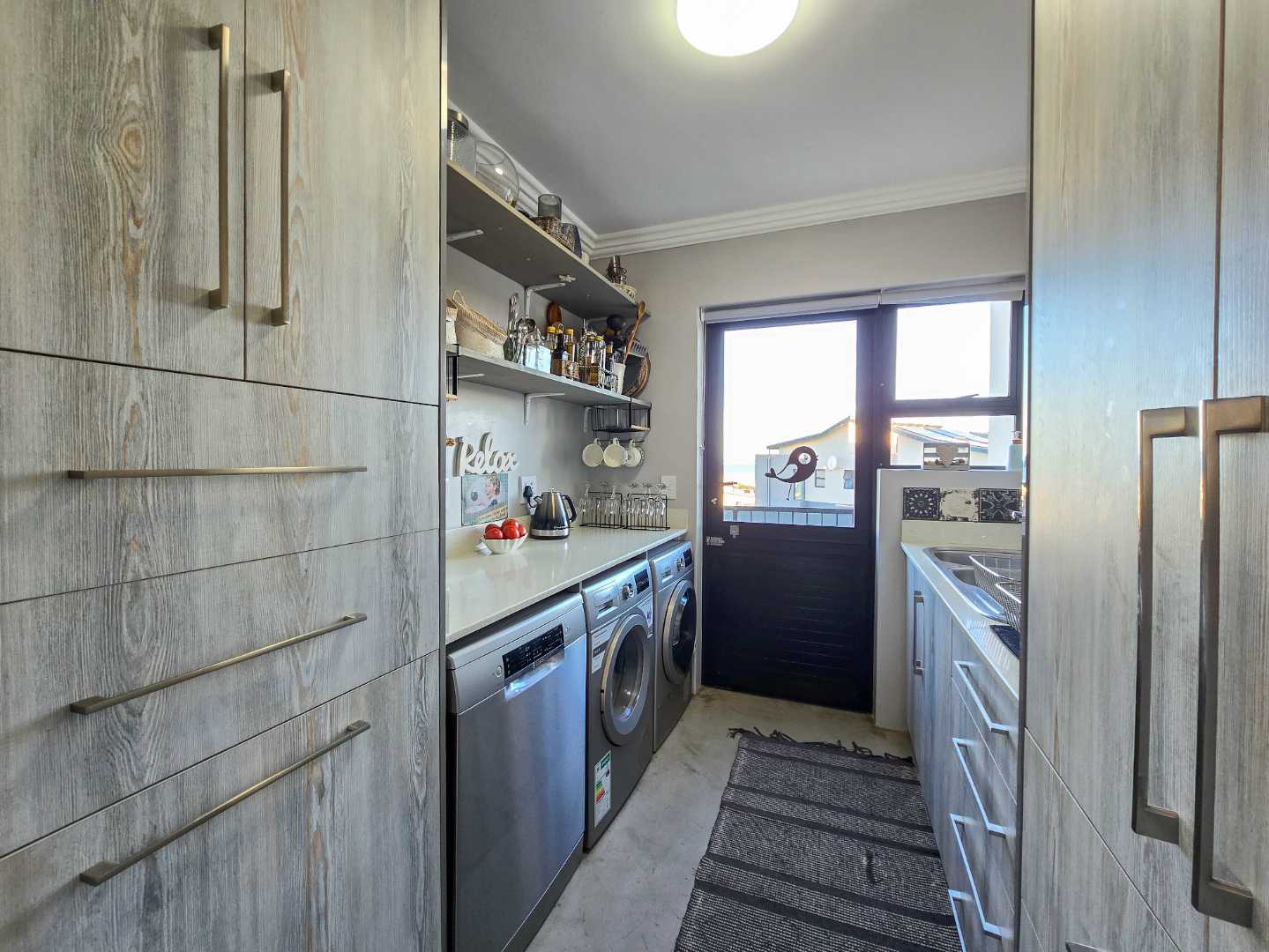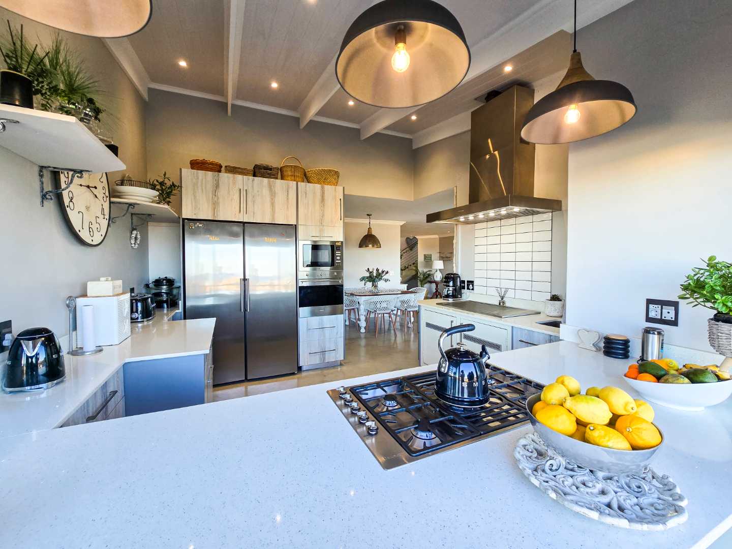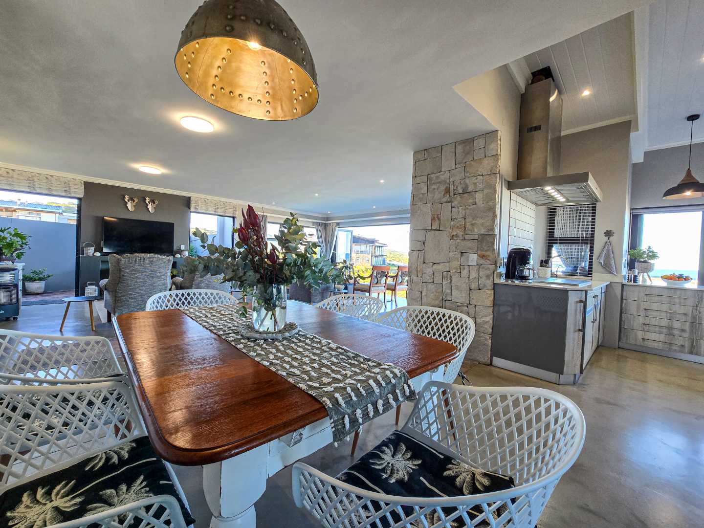 Step into an airy, open-plan living space where the modern kitchen, dining area and lounge flow seamlessly together – ideal for entertaining or spending quality time with family. A built-in braai ensures year-round gatherings, no matter the weather, while a separate scullery and laundry room keep things neat and organized.
