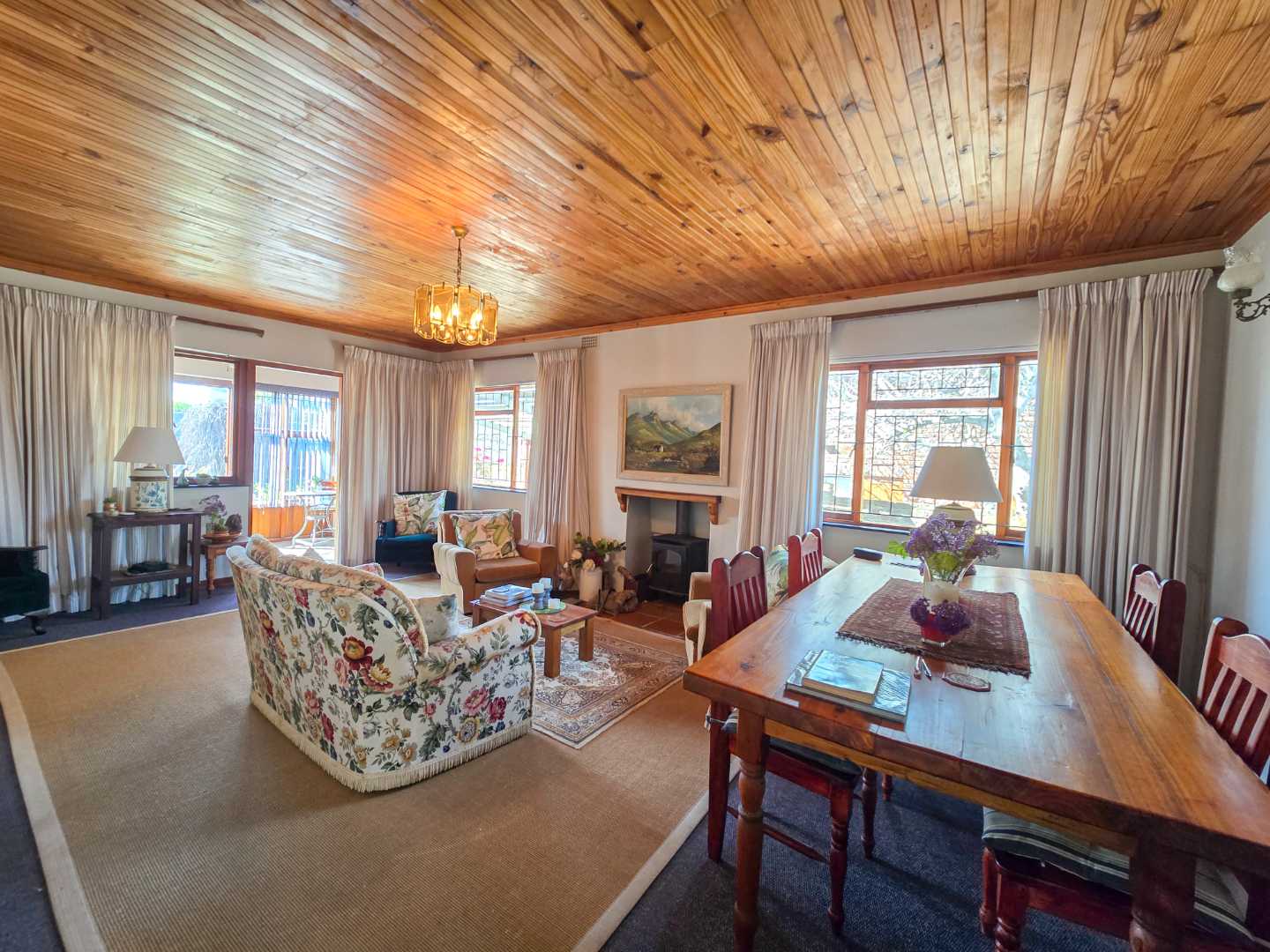 An inviting open-plan living and dining area, with fireplace, flows seamlessly into a sunroom where natural light and garden views take centre stage.
